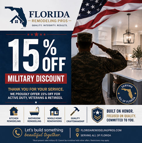 At Florida Remodeling Pros, we are grateful for the bravery and dedication of first responders. As a token of our appreciation, we proudly offer a special discount to help you bring your home project to life. Let our team deliver expert remodeling services while honoring the service you provide every day.